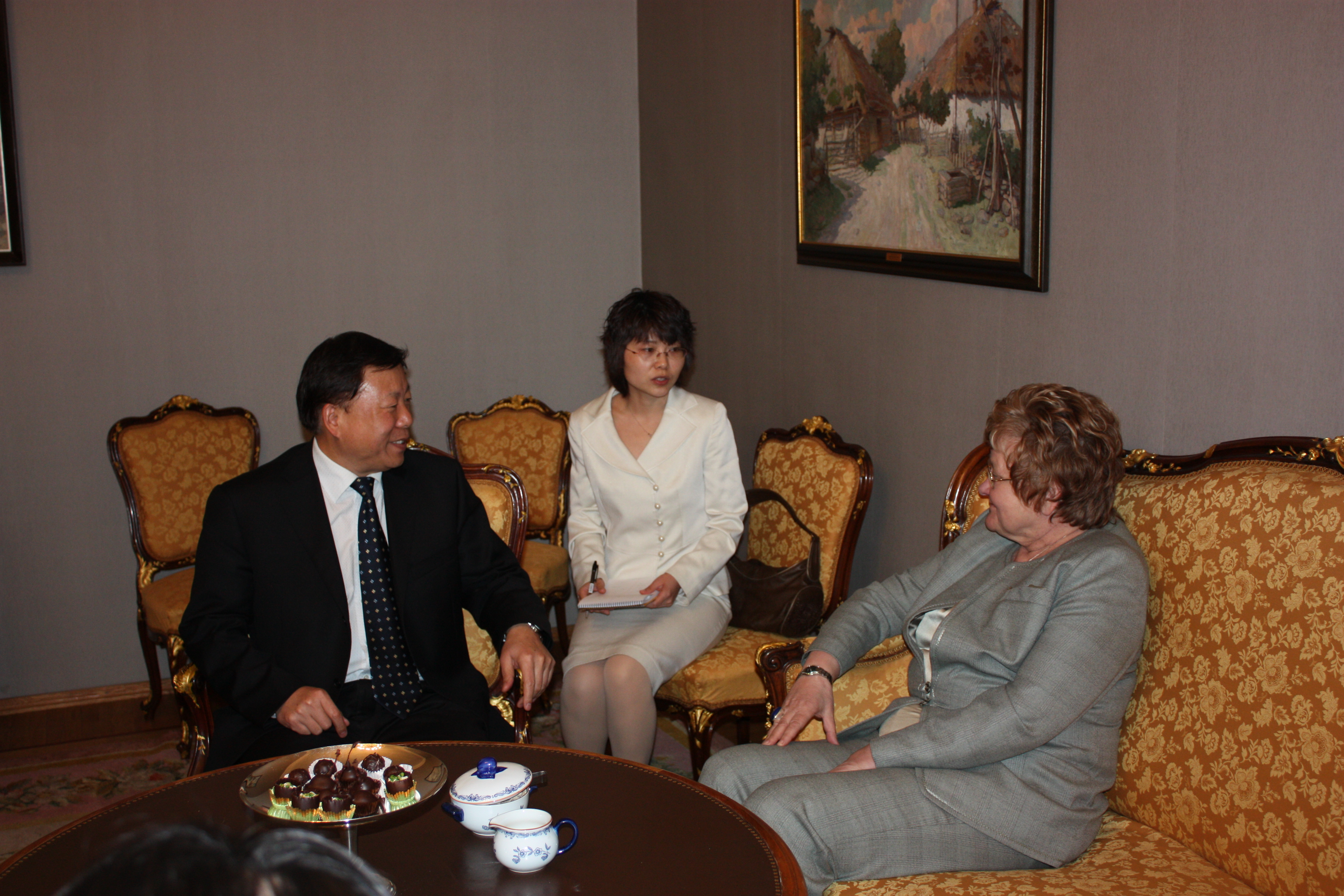 Pildil vestlevad Riigikogu esimees Ene Ergma ja Hiina Rahvavabariigi KP Keskkomitee välissuhete osakonna aseminister Chen Fengxiang. Nende vahel hiina-inglise keele tõlk.