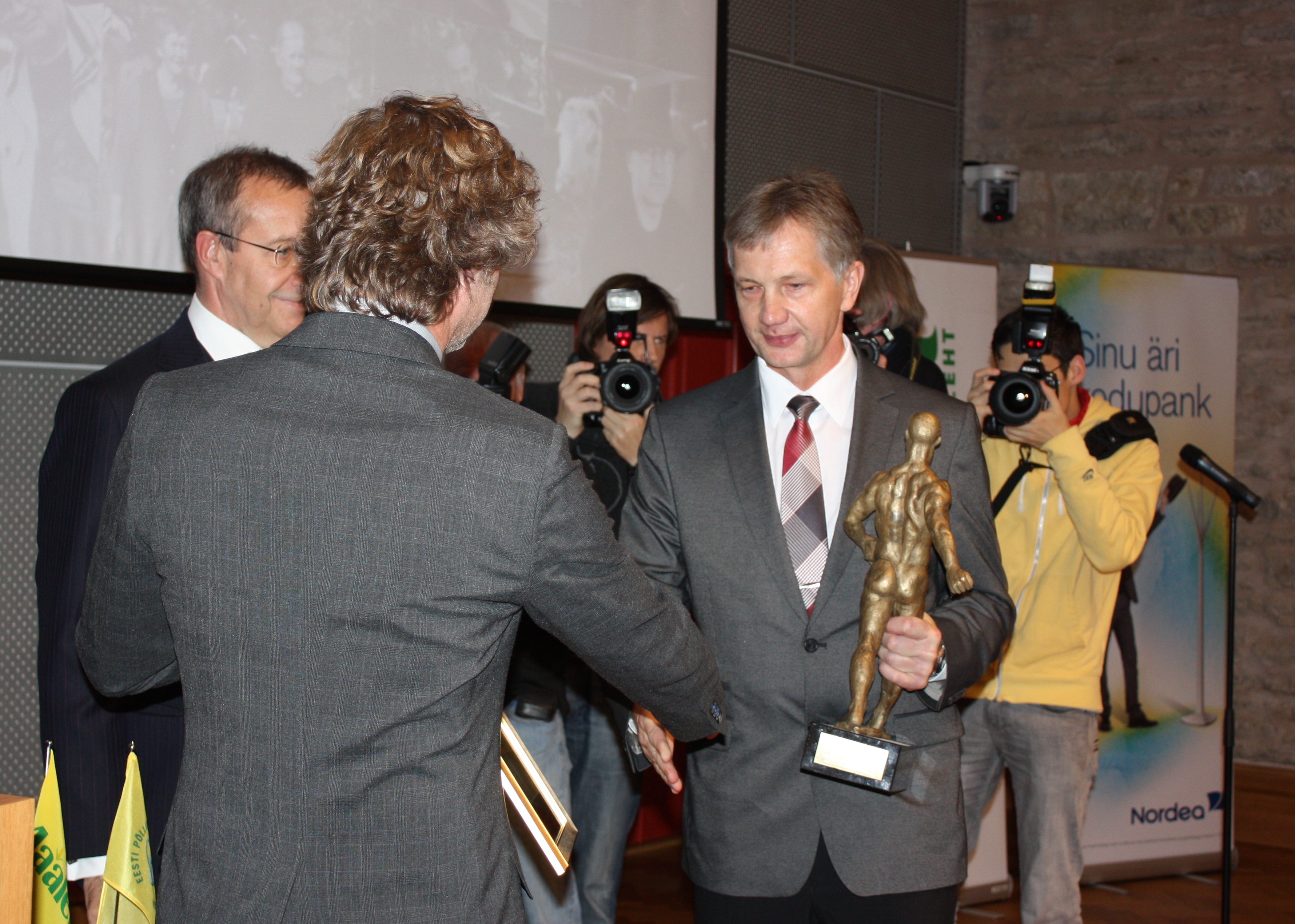 Maalehe peatoimetaja Aivar Viidik ja EV president Toomas Hendrik Ilves hetk enne Aasta Põllumehe väljakuulutamist