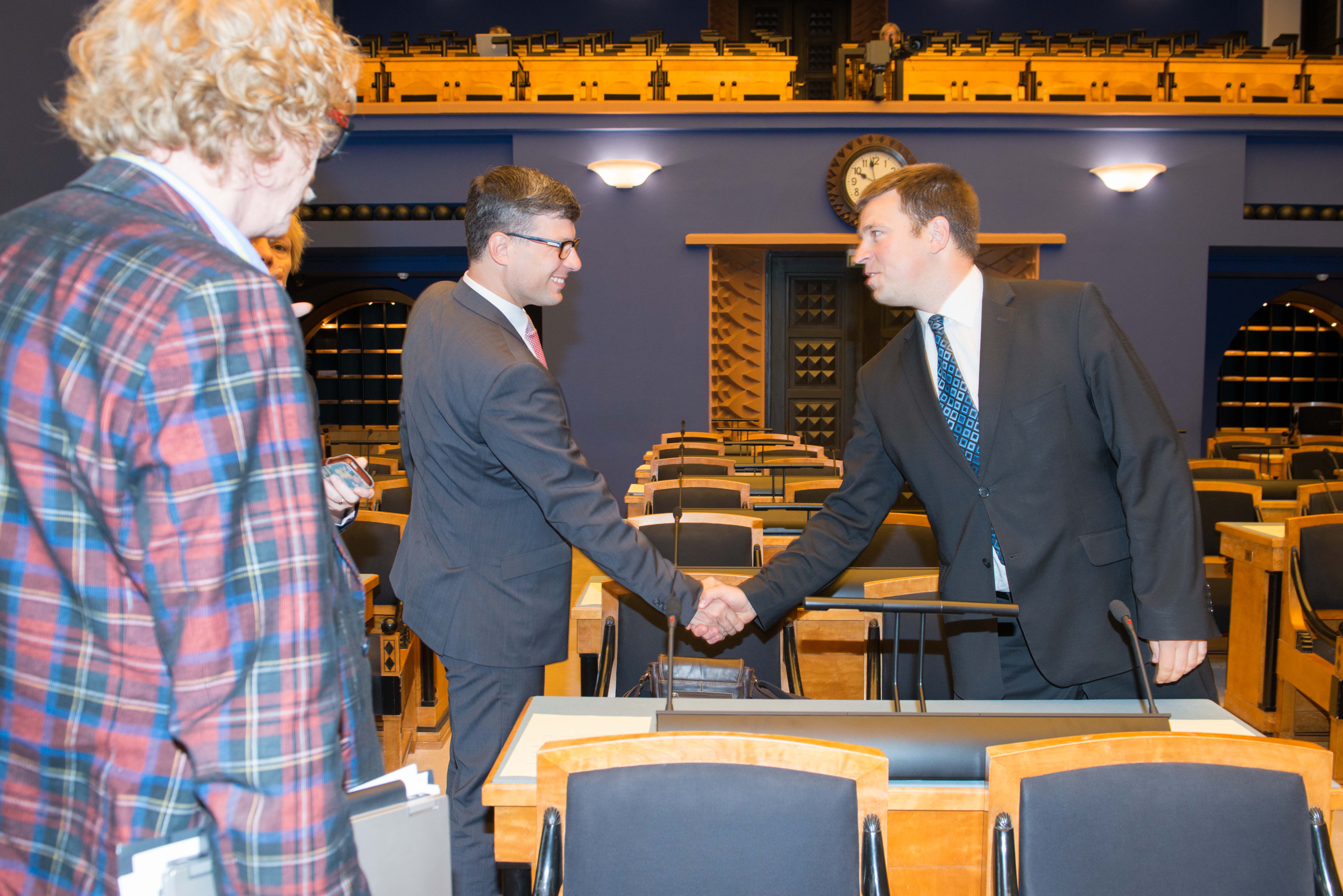 Riigikogu aseesimees Jüri Ratas õnnitleb uut Riigikogu liiget Mihhail Korbi