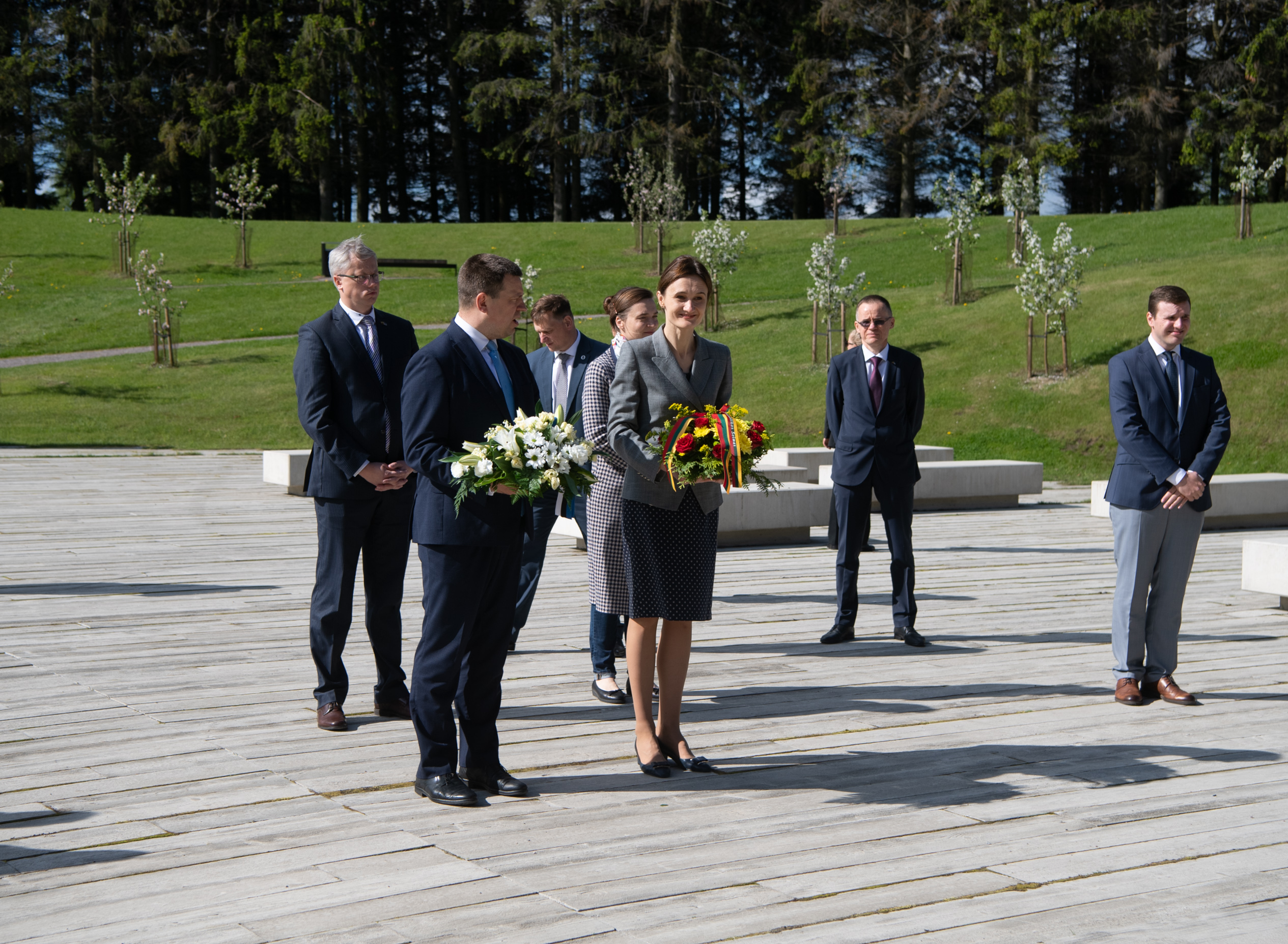 Riigikogu esimees Jüri Ratas ja Leedu parlamendi esimees Viktorija Čmilytė-Nielsen asetamas lilli Maarjamäe memoriaalile