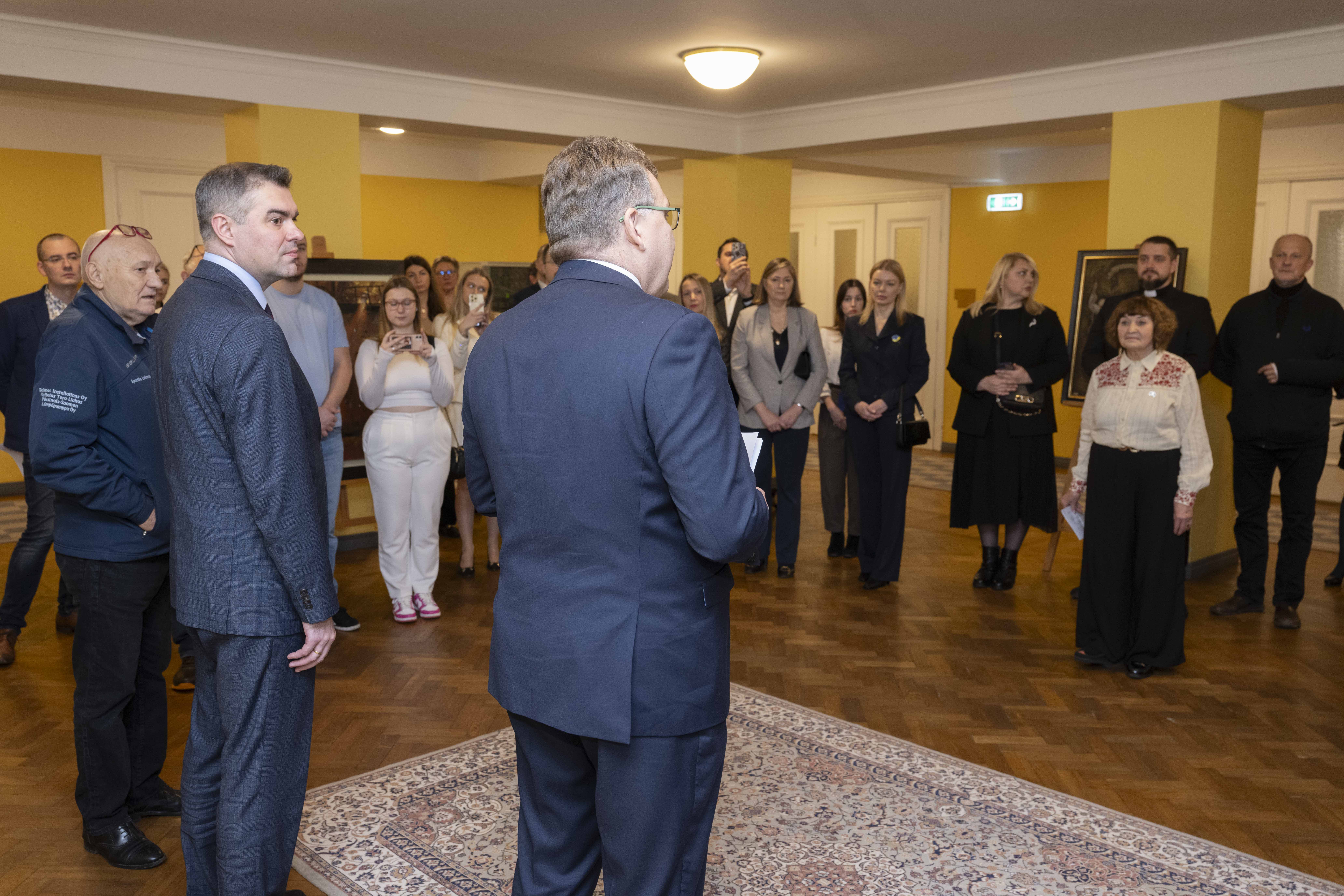 Näituse "Alistumatu Mariupol" avamissündmus. Riigikogu esimees ja Ukraina suursaadik Eestis.
