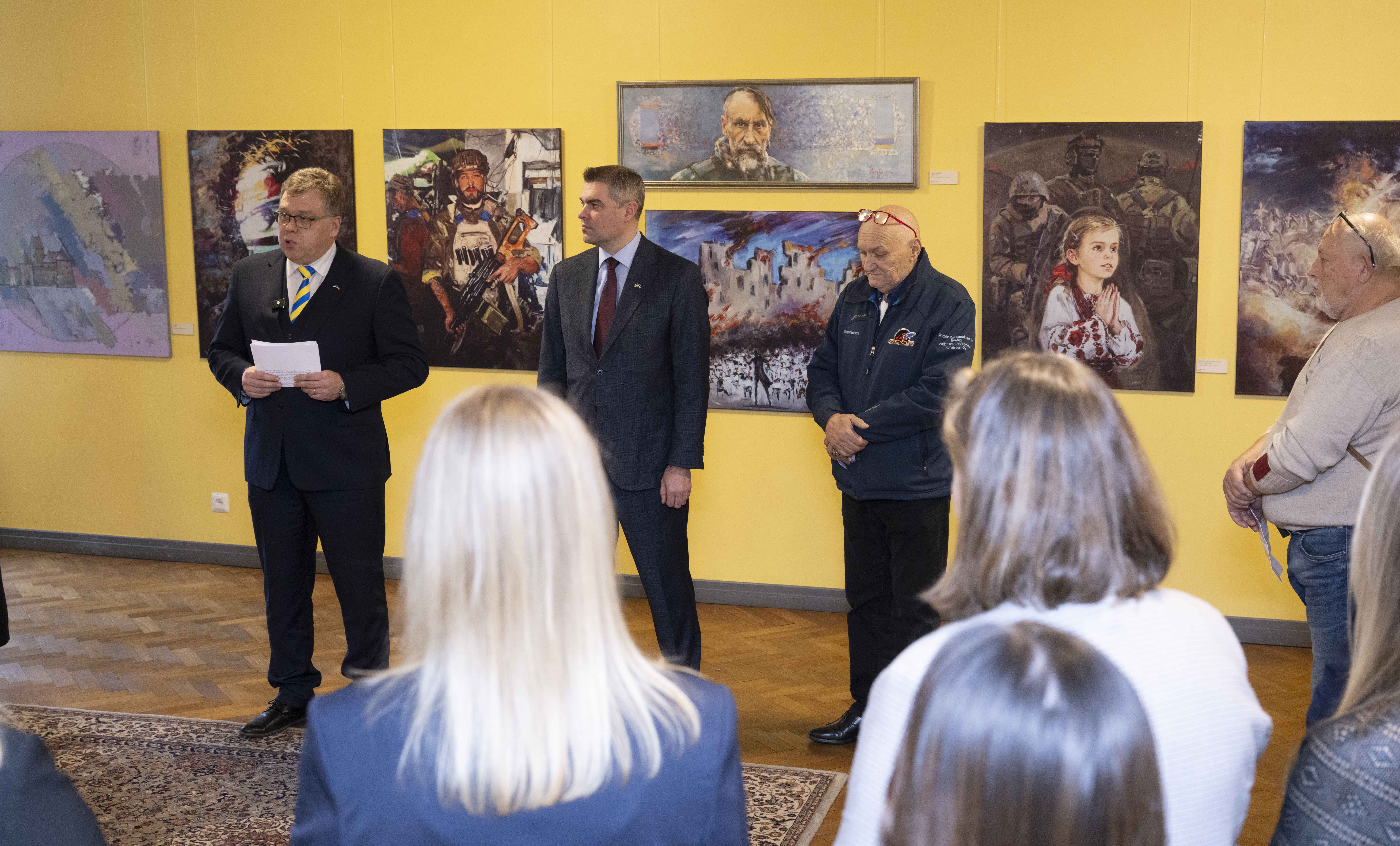 Näituse "Alistumatu Mariupol" avamissündmus. Riigikogu esimees ja Ukraina suursaadik Eestis.