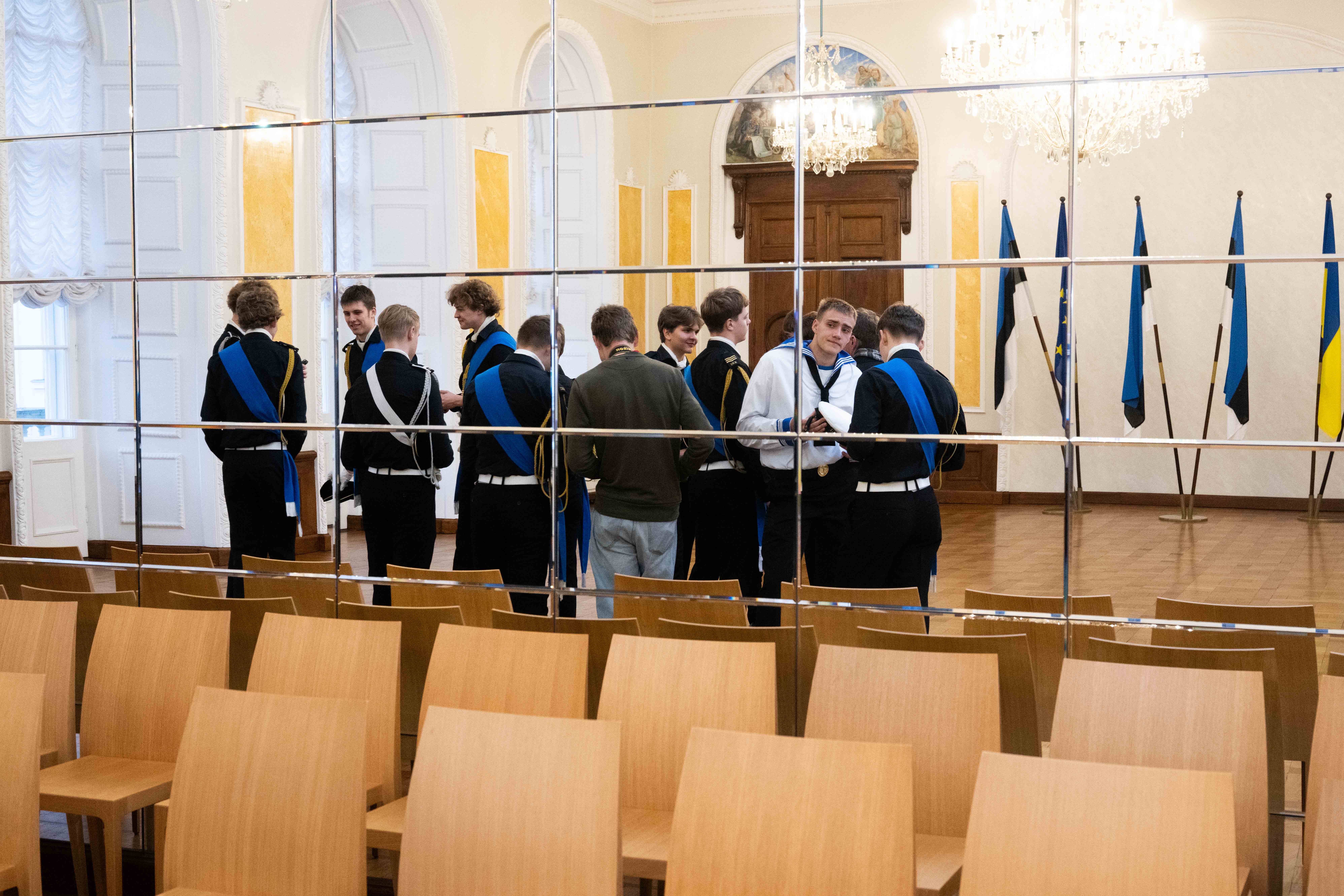 21. Kooli liputoimkond ja Riigikogu esimees Lauri Hussar vastupanupäeva hommikul Riigikogus.